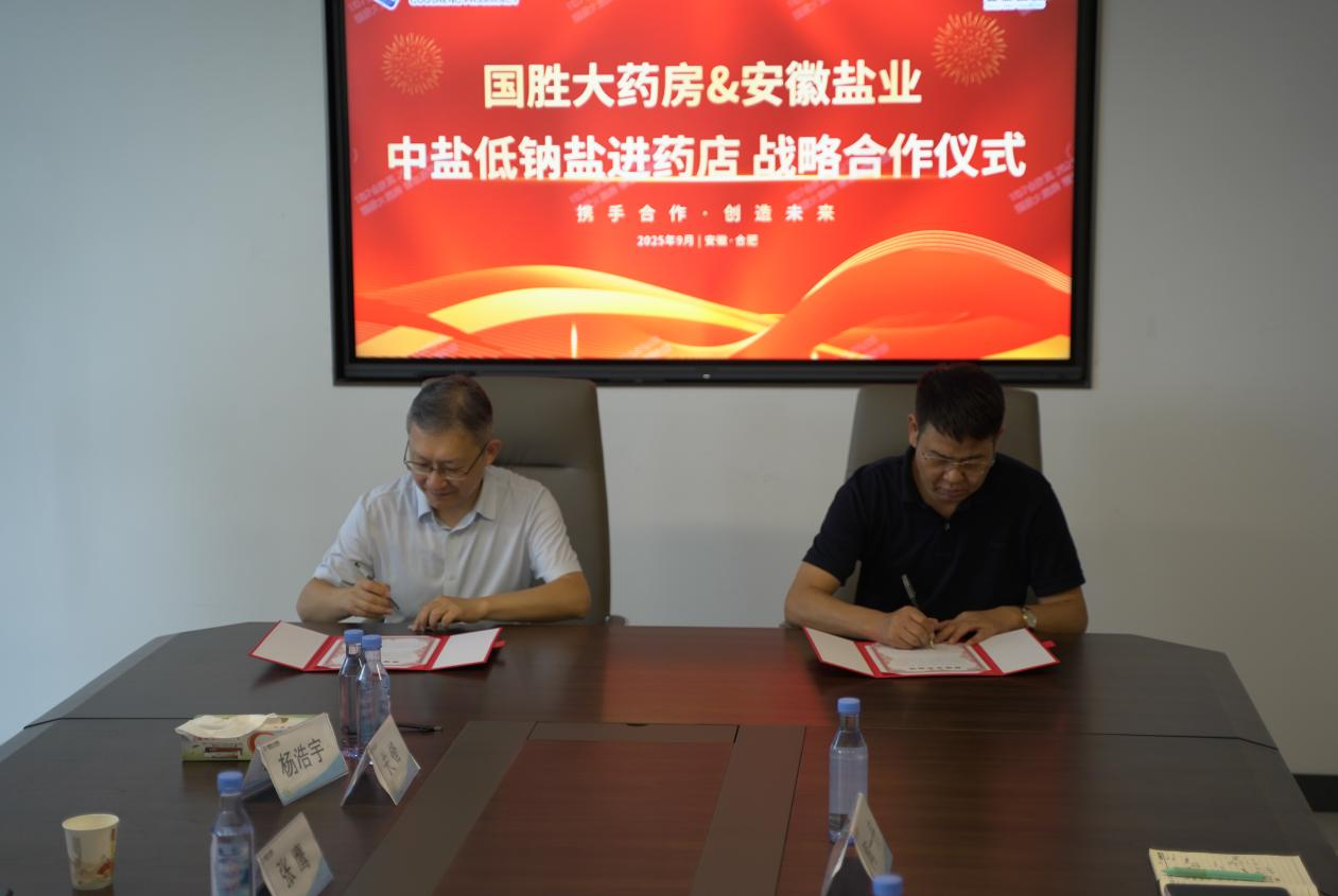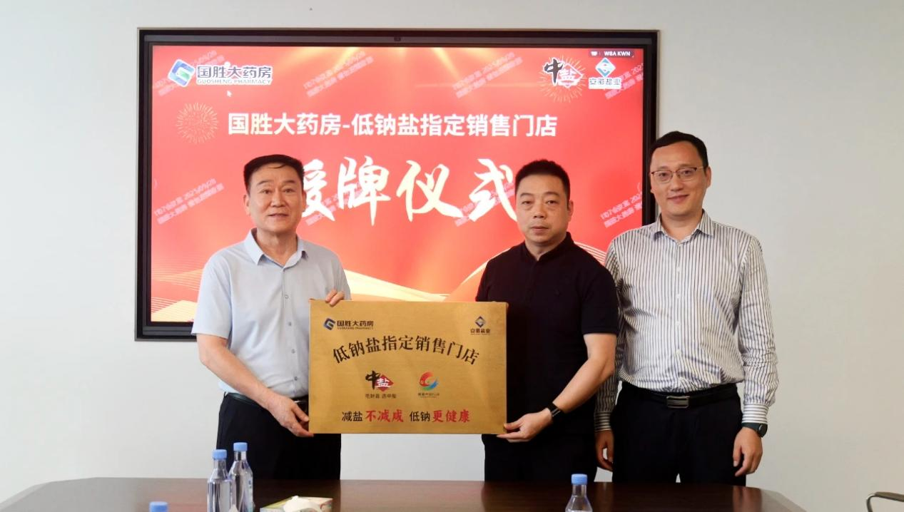 儀式現(xiàn)場(chǎng),雙方圍繞“高鹽飲食危害防控”與“低鈉鹽全民推廣路徑”展開深入研討,達(dá)成了“政策同向、使命同頻”的戰(zhàn)略共識(shí),共同致力于將健康干預(yù)覆蓋至家庭單元。隨后,安徽省鹽業(yè)集團(tuán)與國勝大藥房簽署了戰(zhàn)略合作協(xié)議,安徽省鹽業(yè)集團(tuán)與中鹽東興公司共同向國勝大藥房授予“中鹽低鈉鹽指定銷售門店”牌匾,宣告低鈉鹽的健康推廣與銷售在醫(yī)藥渠道正式啟動(dòng)。